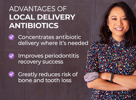 Often paired with scaling and root planing or laser treatment is the use of antibiotics. This additional service allows us to remain more confident in the removal and eradication of bad bacteria within the gum tissue. When applied to the gum pockets, the medicine’s tiny microspheres begin to disperse over several weeks, getting rid of anything that can harm your soft oral tissues.